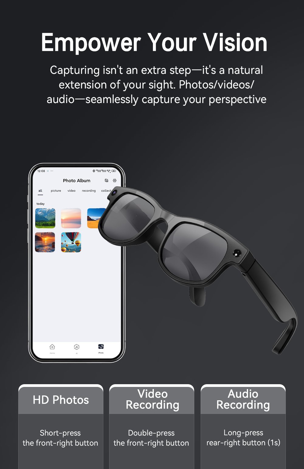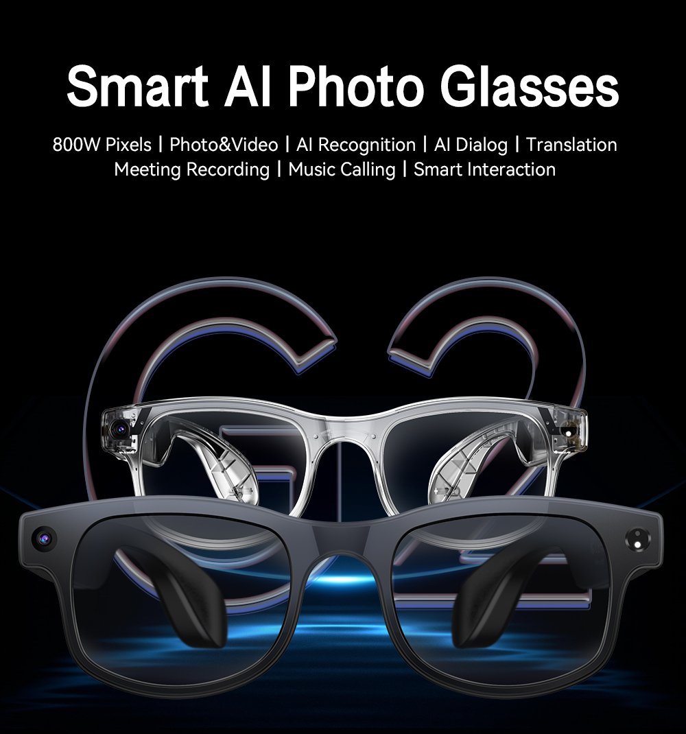 Functions:AI voice wake-up, AI photo recognition,AI intelligent question-and-answer interaction,AI smart translation,High-definition photography and video recording,Wi-Fi transfer of photos,Videos,and recordings to phone, Adjust volume, Wear detection, Dual microphone noise reduction, Call noise reduction, Intelligent voice assistant, Bluetooth calls, Music playback (switch, pause music)