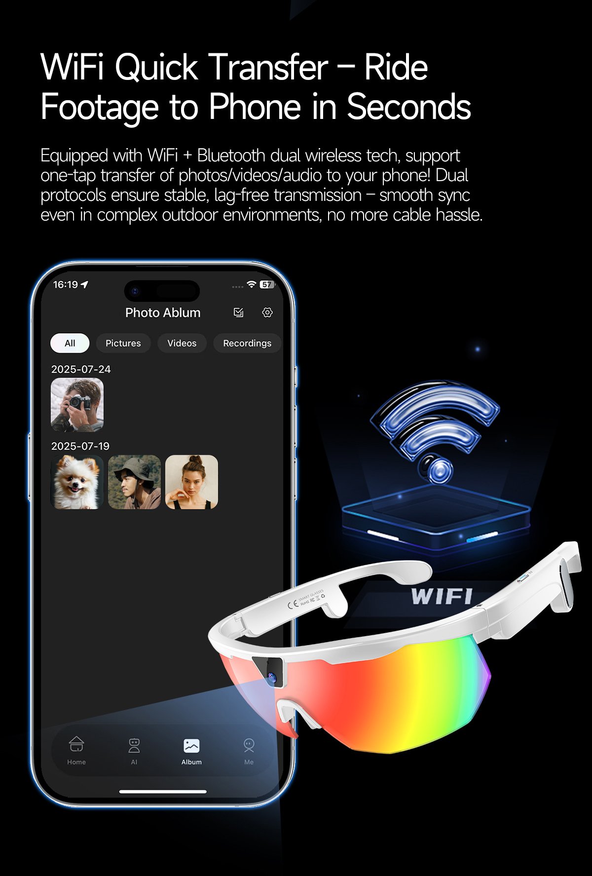 Functions:AI voice wake-up, AI photo recognition,AI intelligent question-and-answer interaction,AI smart translation,High-definition photography and video recording,Wi-Fi transfer of photos,Videos,and recordings to phone, Adjust volume, Wear detection, Dual microphone noise reduction, Call noise reduction, Intelligent voice assistant, Bluetooth calls, Music playback (switch, pause music)