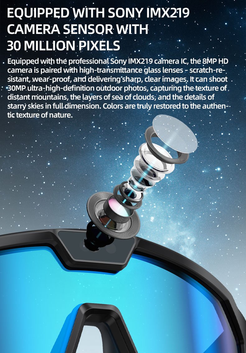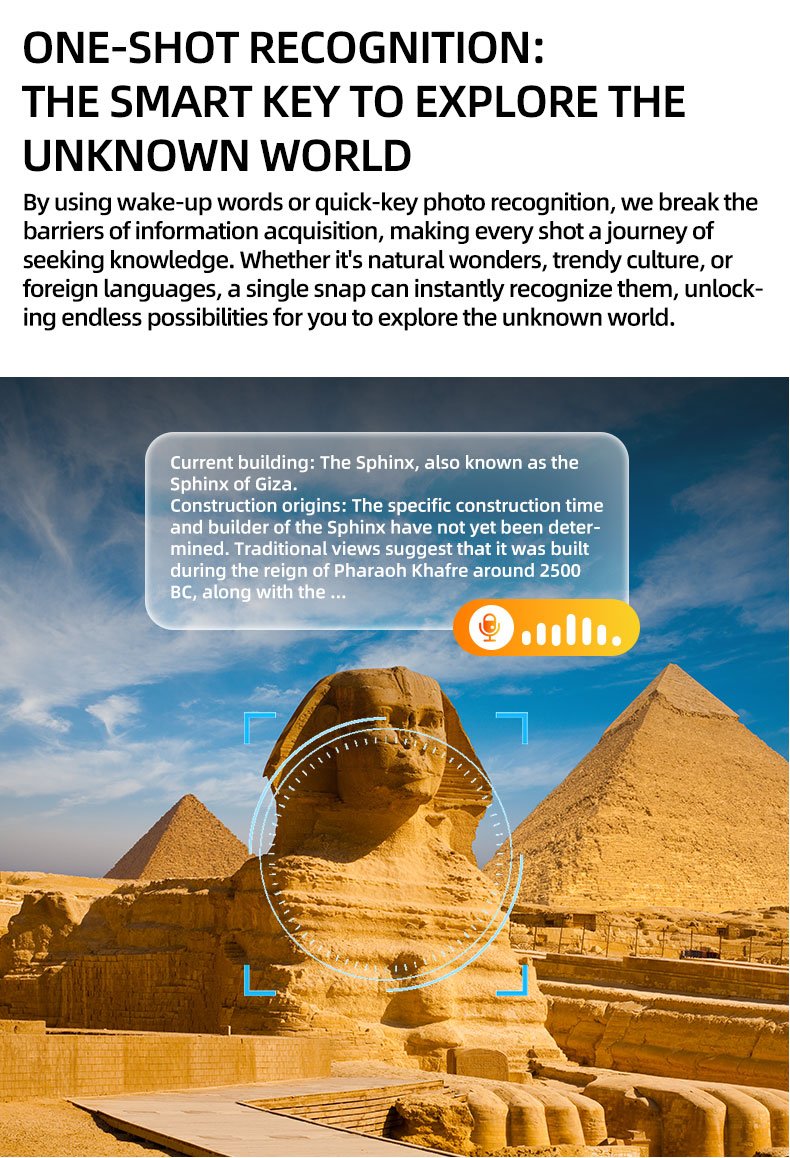 Functions:AI voice wake-up, AI photo recognition,AI intelligent question-and-answer interaction,AI smart translation,High-definition photography and video recording,Wi-Fi transfer of photos,Videos,and recordings to phone, Adjust volume, Wear detection, Dual microphone noise reduction, Call noise reduction, Intelligent voice assistant, Bluetooth calls, Music playback (switch, pause music)