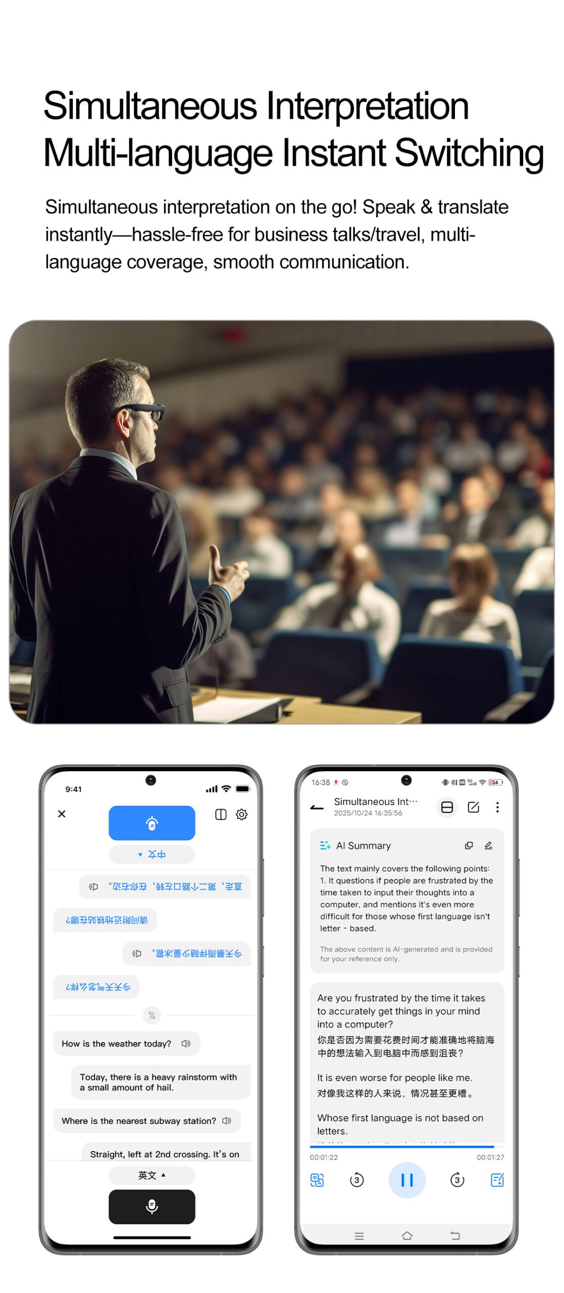 Functions:AI voice wake-up, AI photo recognition,AI intelligent question-and-answer interaction,AI smart translation,High-definition photography and video recording,Wi-Fi transfer of photos,Videos,and recordings to phone, Adjust volume, Wear detection, Dual microphone noise reduction, Call noise reduction, Intelligent voice assistant, Bluetooth calls, Music playback (switch, pause music)