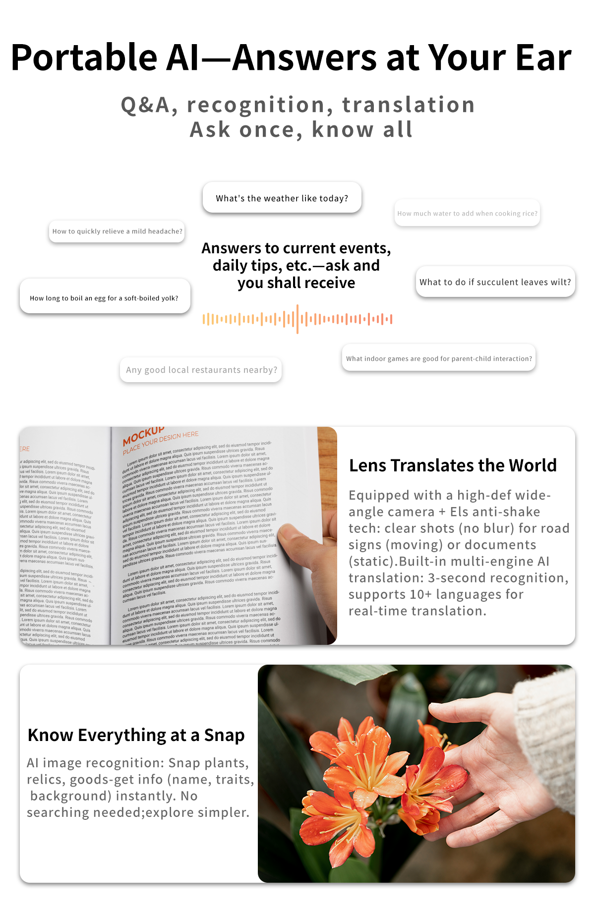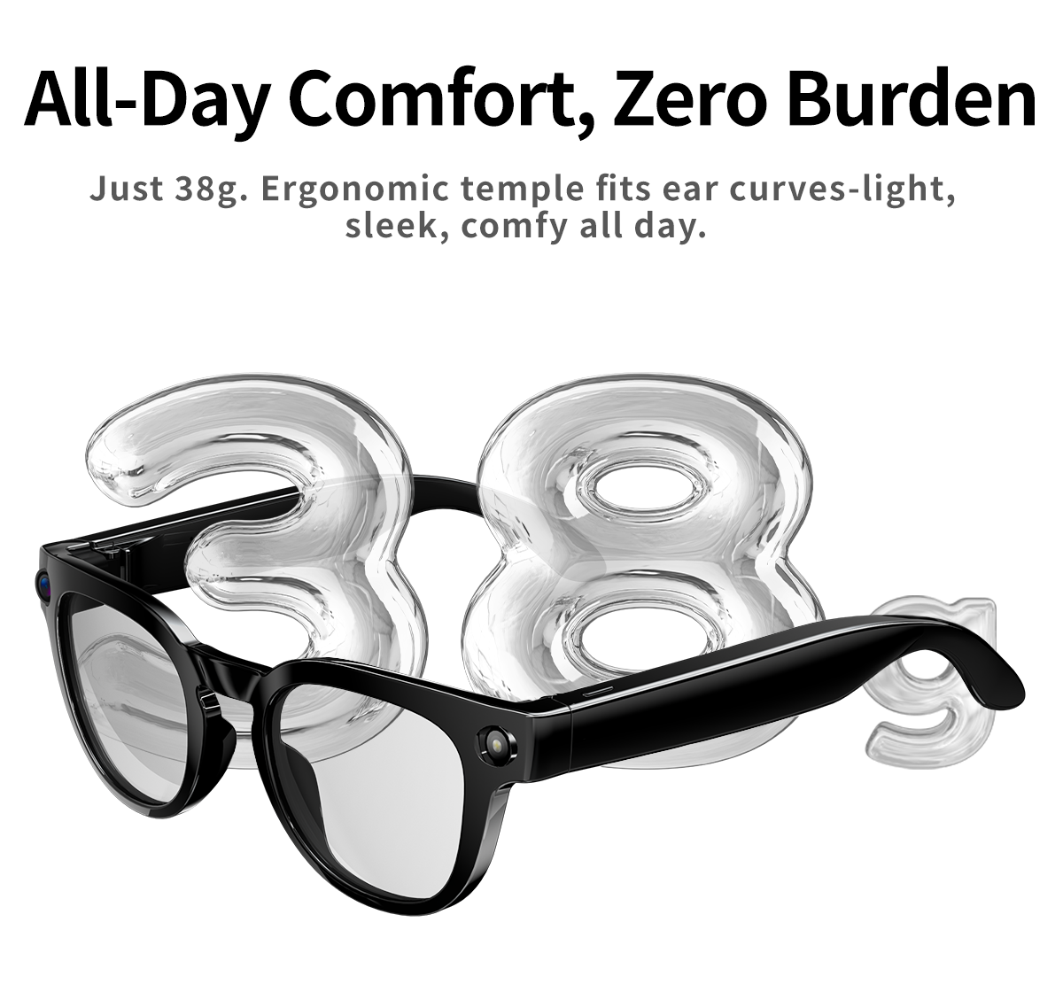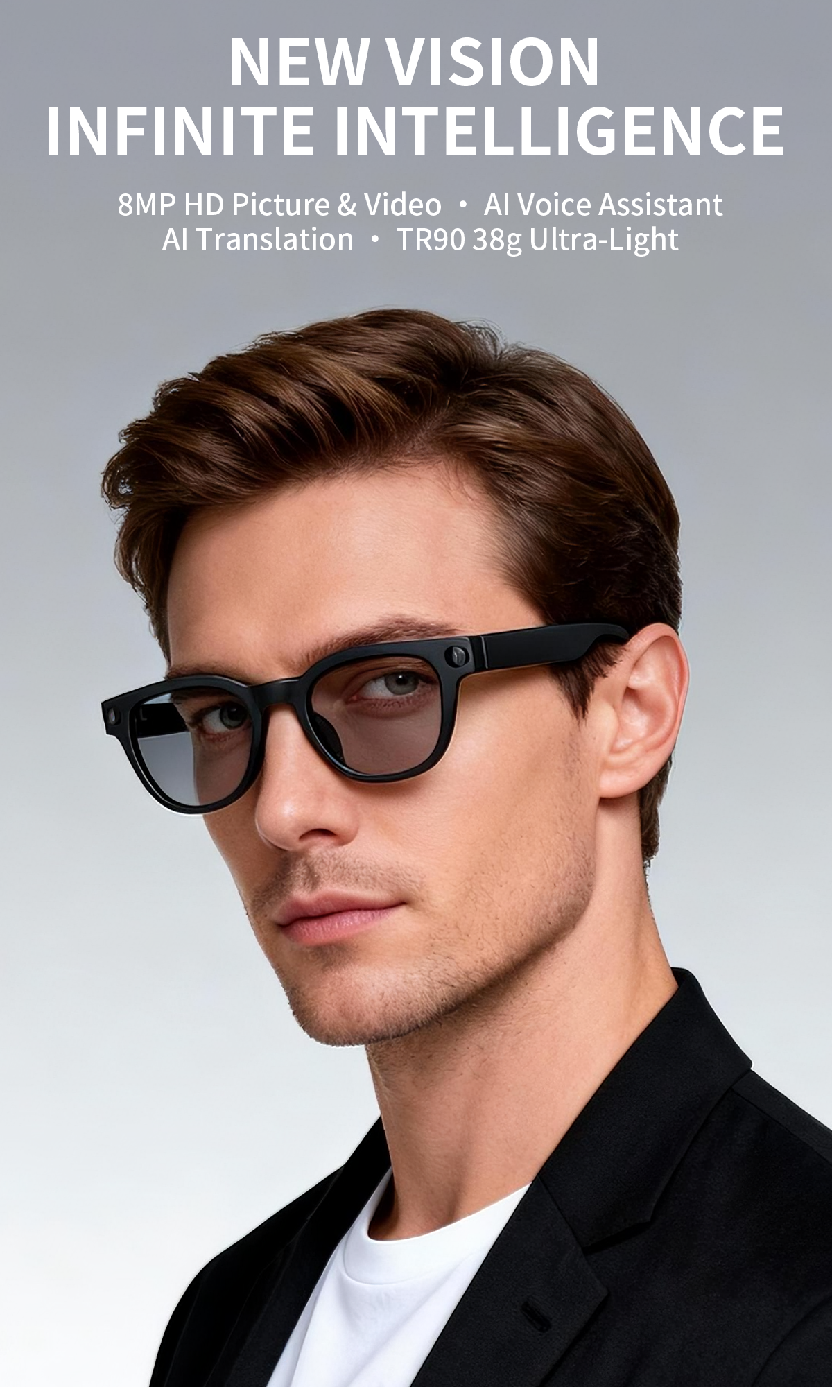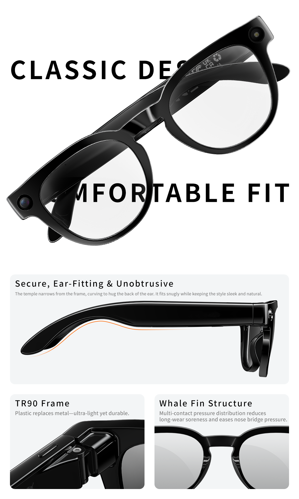 Functions:AI voice wake-up, AI photo recognition,AI intelligent question-and-answer interaction,AI smart translation,High-definition photography and video recording,Wi-Fi transfer of photos,Videos,and recordings to phone, Adjust volume, Wear detection, 2 microphones noise reduction, Call noise reduction, Intelligent voice assistant, Bluetooth calls, Music playback (switch, pause music)