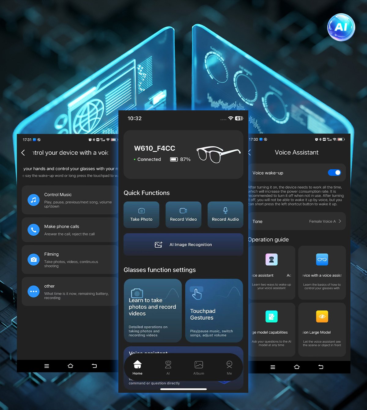 Functions:AI voice wake-up, AI photo recognition,AI intelligent question-and-answer interaction,AI smart translation,High-definition photography and video recording,Wi-Fi transfer of photos,Videos,and recordings to phone, Adjust volume, Wear detection, Dual microphone noise reduction, Call noise reduction, Intelligent voice assistant, Bluetooth calls, Music playback (switch, pause music)